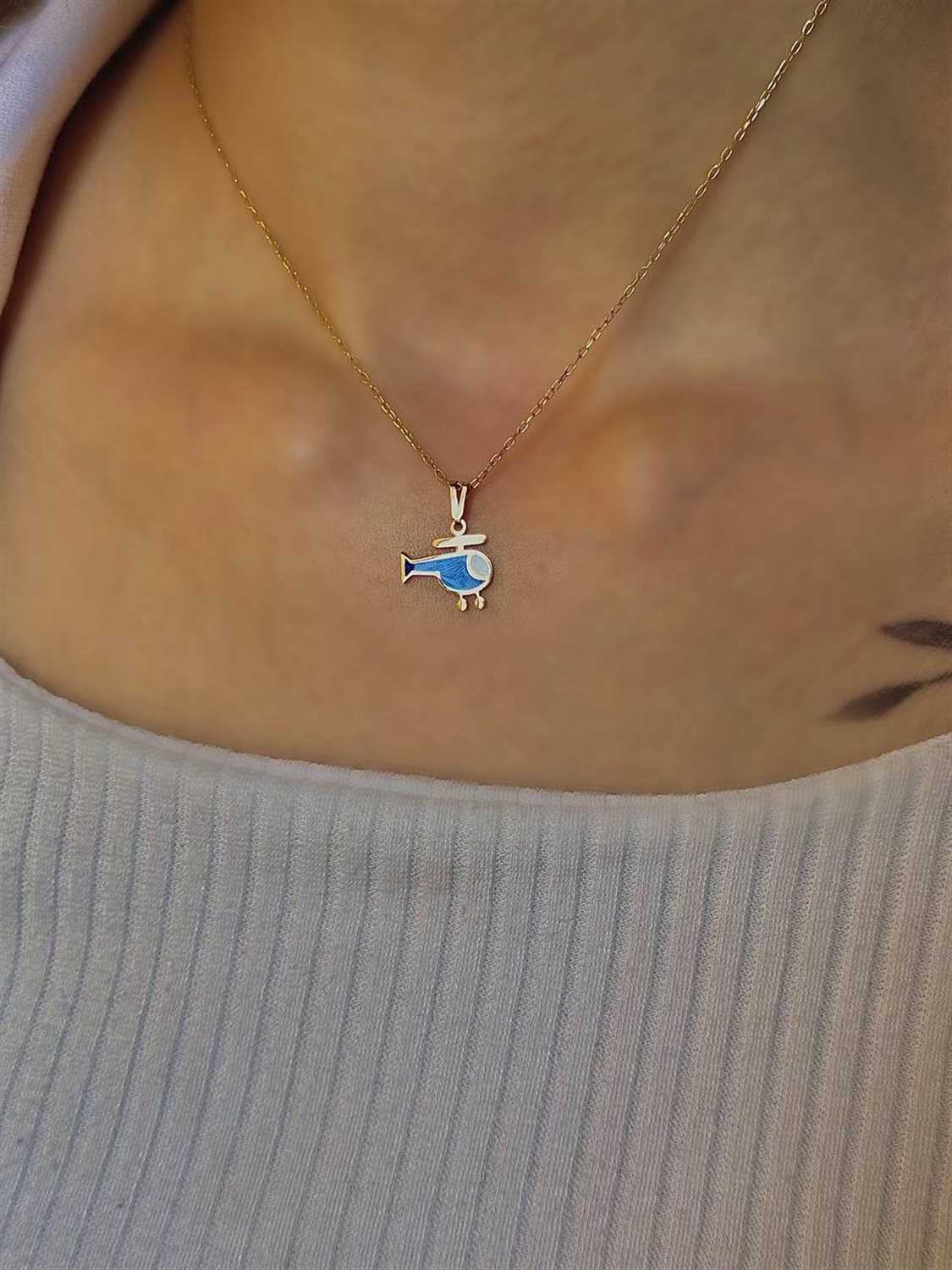 پلاکی از طلای ۱۸ عیار با طراحی هلیکوپتر و میناکاری رنگی. مناسب برای کودکان و نوجوانان با استایلهای فانتزی.